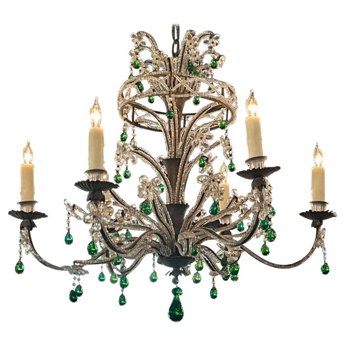 Mid Century Italian Beaded Chandelier with Green Drops